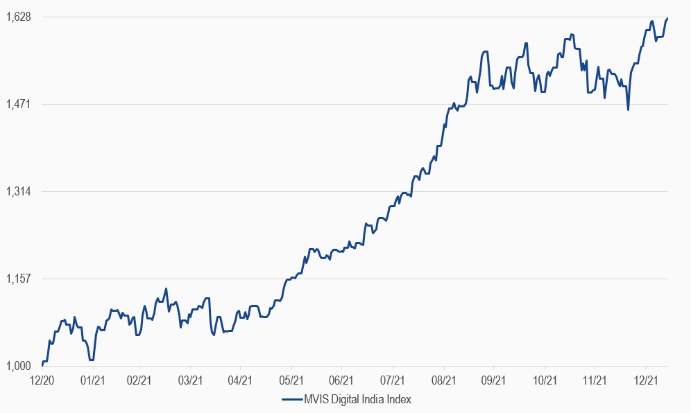 The market has responded well to the infusion of money and the increased frequency of IPOs. A good indicator for these upward trends is the MVIS Digital India Index (ticker: MVDIND). The index, which tracks the performance of the largest and most liquid digital companies in India, is up more than 51% over the last year, as of Wednesday, January 13th, 2022.